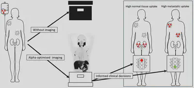 Alpha therapy imaging with current technology suffers from low count rates and high scatter. Building on our previous pilot studies and early-phase clinical trials, the project will develop new imaging technologies specifically adapted to these challenges. The research will include the development of optimized reconstruction built with refined simulation models for camera response, validation through prospective studies with parallel clinical trials, and in silico models to prepare future clinical trials.